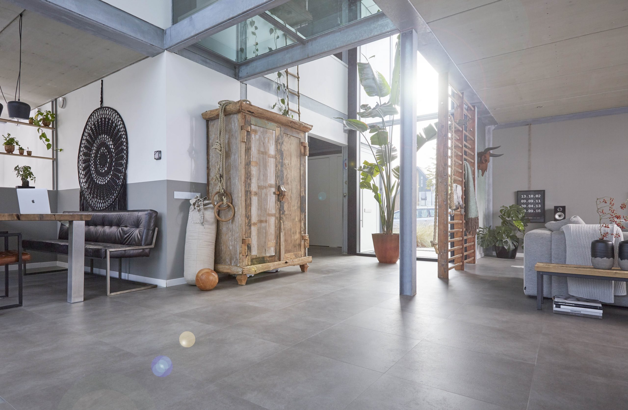 Deze betonlook tegel lijkt op een industri?le betonnen vloeren, maar heeft de voordelen van zacht, sterk en onderhoudsvriendelijk pvc. Verkrijgbaar in extra grote tegel van maarliefst 60x60 cm. De click uitvoering is ook verkrijgbaar in een rechthoekig formaat met een afmeting van 81,2 x 40,6 cm.