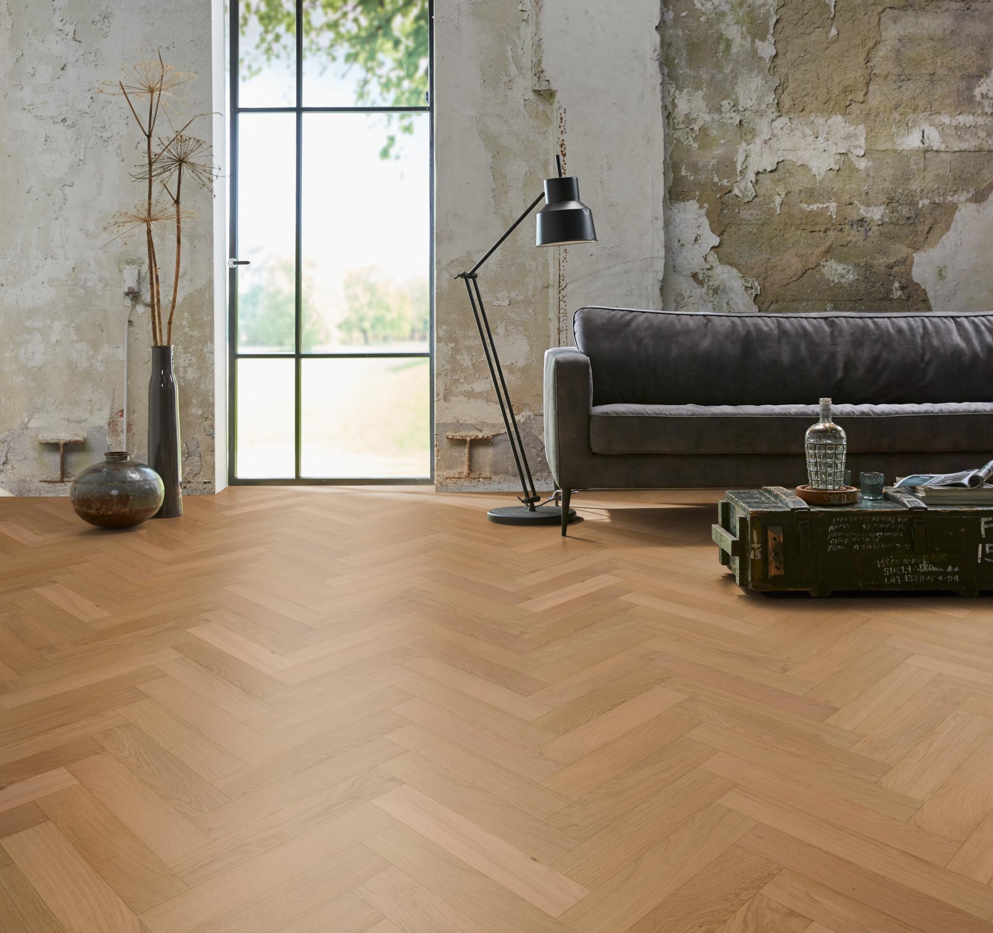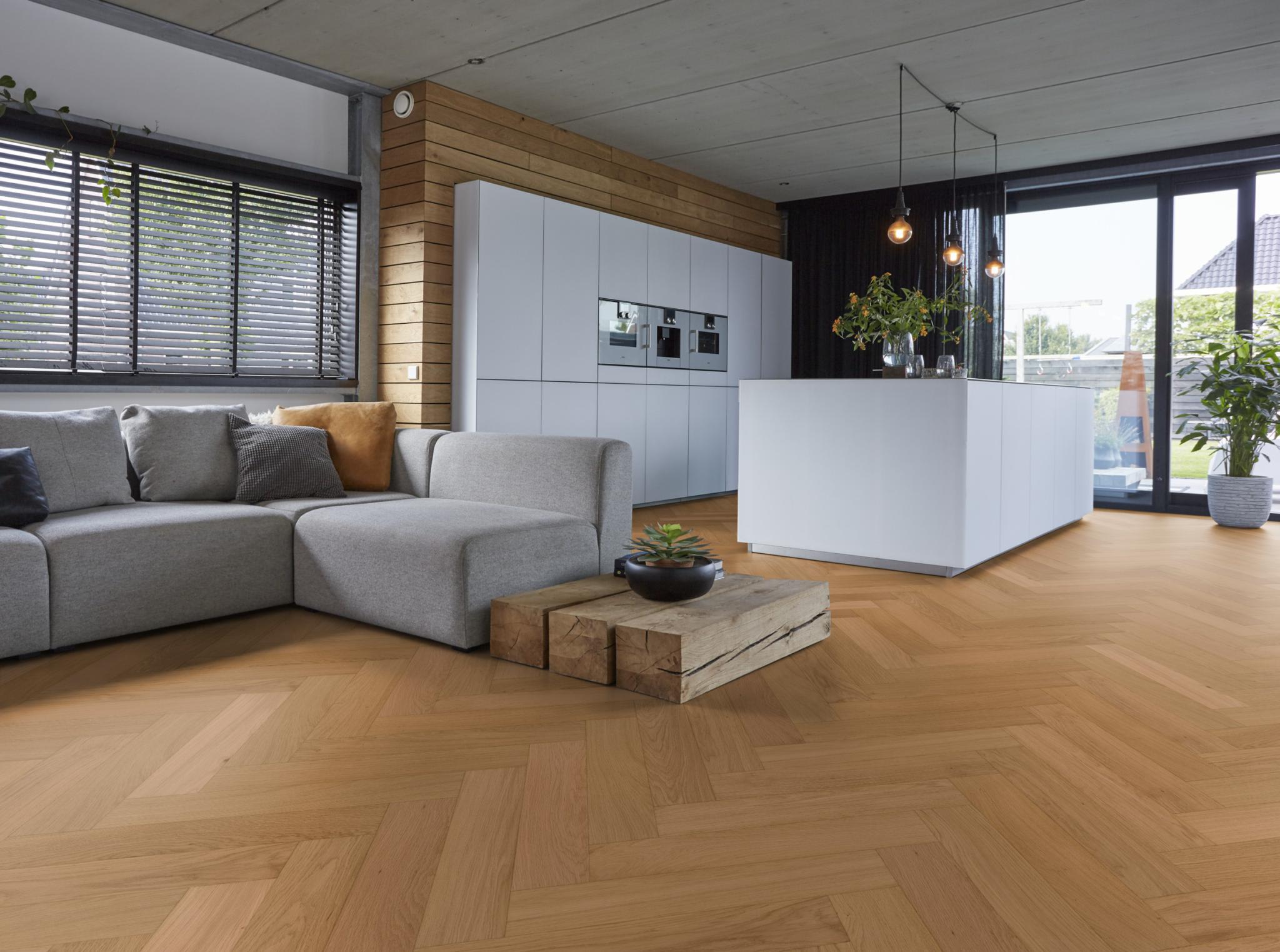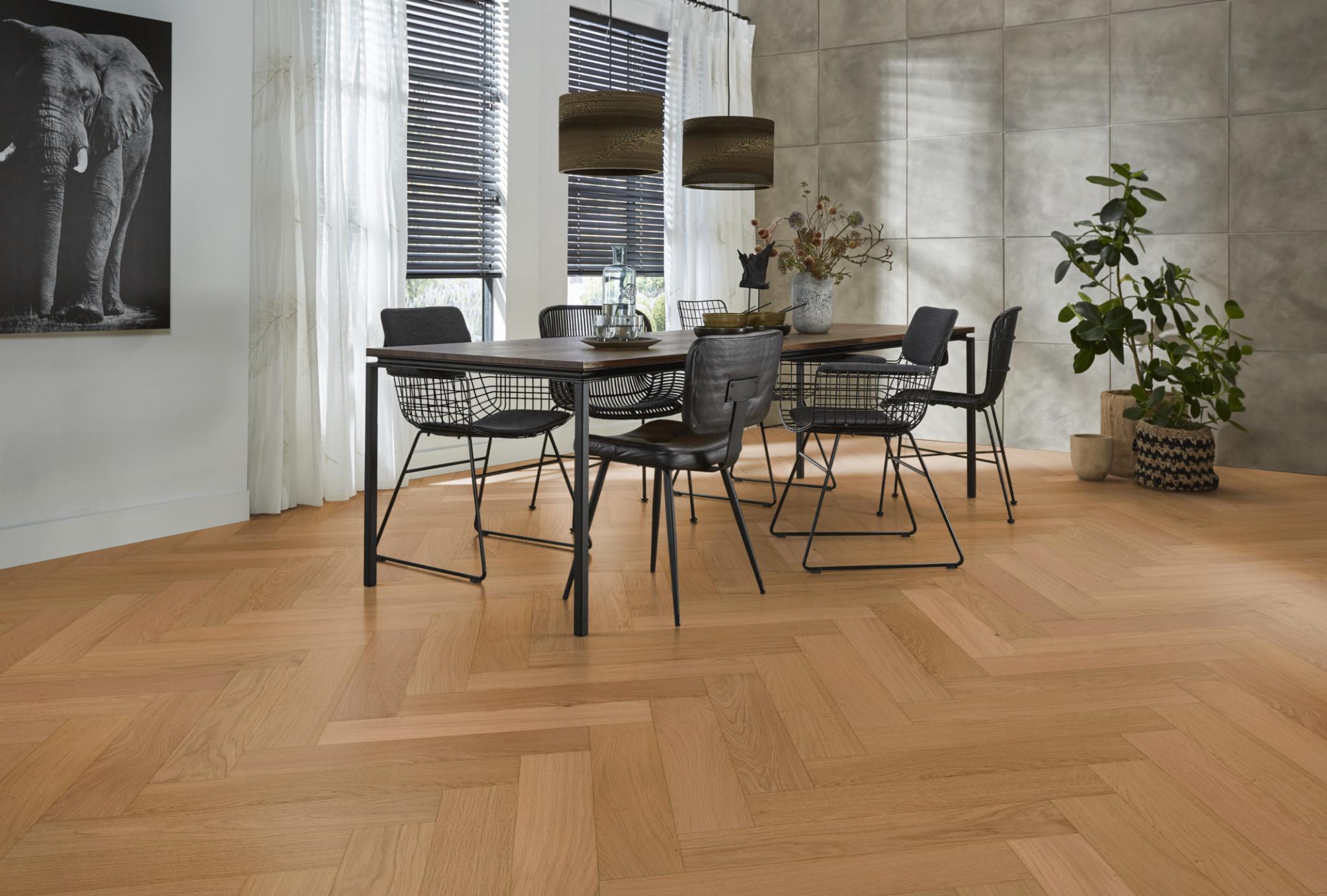 Een visgraatvloer met mooie rustige sortering. De exclusiviteit straalt van deze unieke vloer af! Dit selecte parket is prachtig egaal van kleur en geolied verkrijgbaar in de kleuren wit, blank en naturel. Daarnaast is deze vloer ook onbehandeld verkrijgbaar zodat je deze in elke gewenste vloer kunt lakken of oli?n. Met de toplaag van 3mm heb je jarenlang plezier van jouw nieuwe vloer.